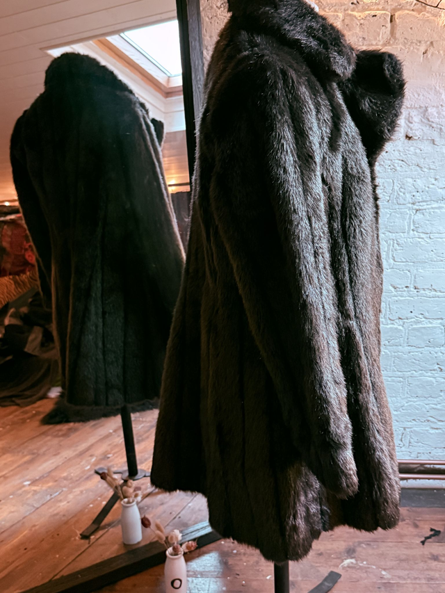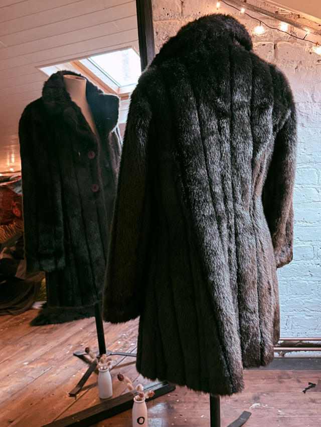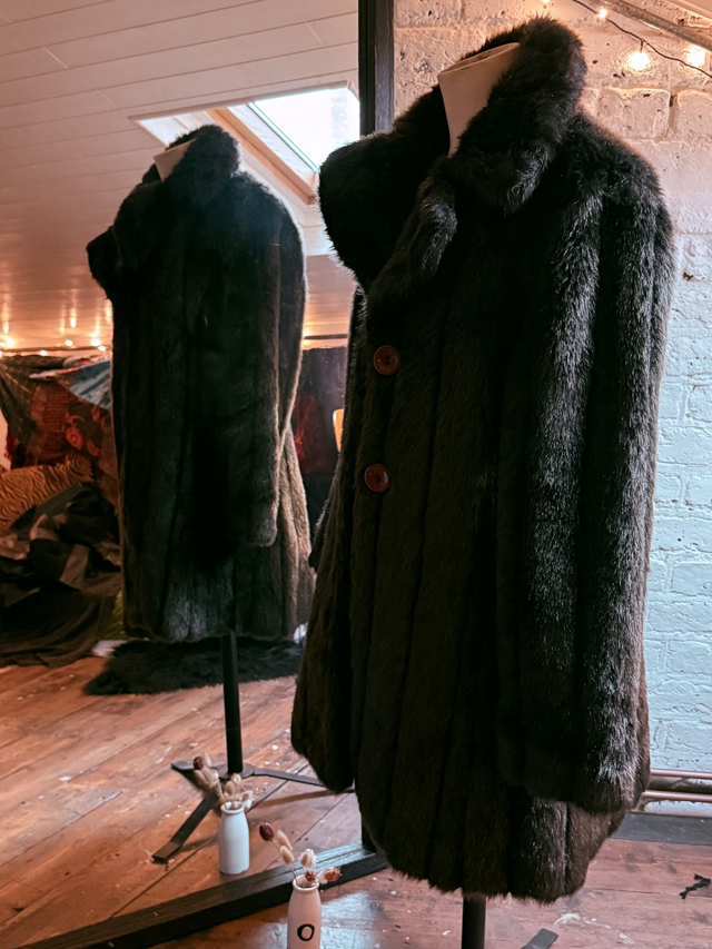 A timeless vintage faux fur jacket in a rich brown tone, designed to bring instant glamour to your winter wardrobe.Luxuriously soft with a beautifully structured drape, this coat creates a flattering, elegant silhouette while keeping you warm on crisp winter mornings. Featuring gorgeous statement buttons and a plush collar, it effortlessly elevates both casual and dressed-up looks. Perfect for layering over knits, dresses, or tailoring, this jacket is a true cold-weather classic with vintage charm.